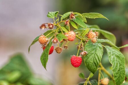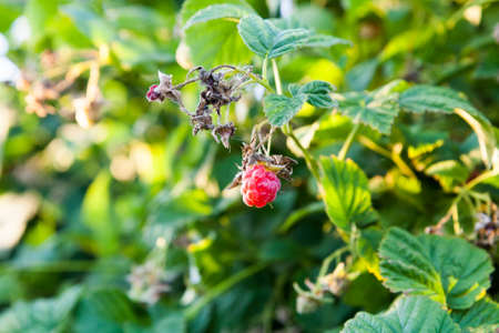 Closeup of growing organic raspberries. Ripe Raspberry in the fruit garden. Selective focus.