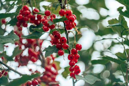 Juicy ripe red berries of red-flowering currant hanging on branch of bush with green leaves in garden. Vitamins, summertime, harvest, preservation, vegetarian, nature concept. Soft focus, copy space.