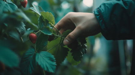 close up hand of A worker picking a fresh strawberry at farm - ai
