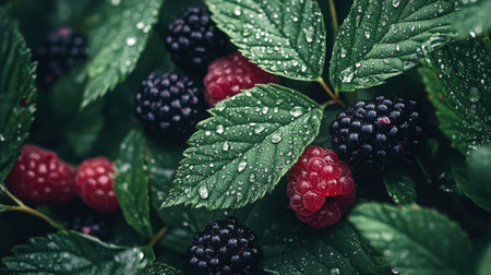 Clusters of ripe blackberries and red berries nestled among vibrant green leaves, glistening with droplets of water.