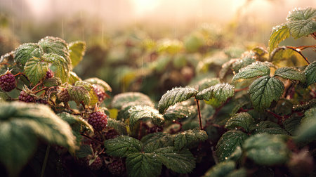 A panoramic wide view of Boysenberry field growing closely together in a dewy morning shining droplets on leaves warm soft daylight ultra realistic photography cinematic wide composition lifelike natural scene