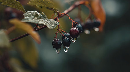 Soft rain falling gently on Mulberry black, with water droplets forming and slowly dripping. The background is softly blurred with a natural, moody atmosphere.