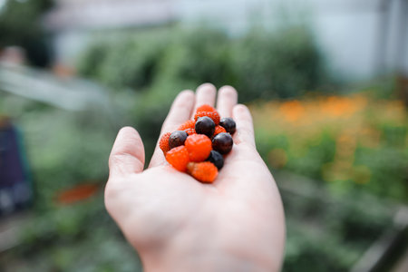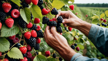 Hands carefully select ripe berries from lush bushes, capturing the essence of harvest time and organic produce.. AI Generation