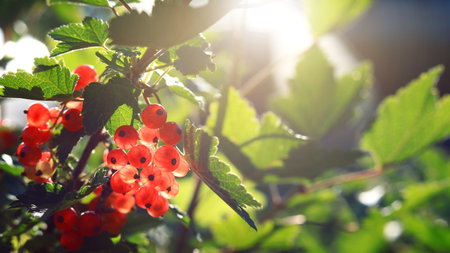 Red currant berries and green leaves in the autumn garden on a sunny day