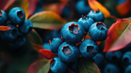 A close up of blue and red berries. The blue berries are surrounded by red leaves. The image has a vibrant and colorful mood