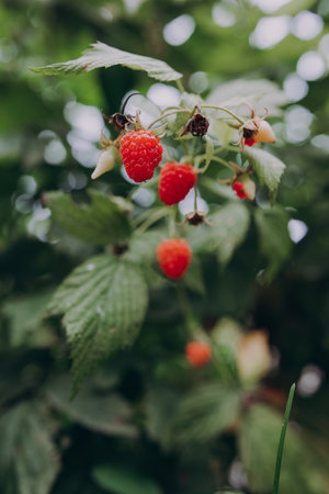 Raspberry in the forest on a sunny summer day. Selective focus.