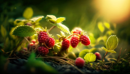 An AI generated illustration of a fresh raspberry bush blooming in a sunny lush green grassy field
