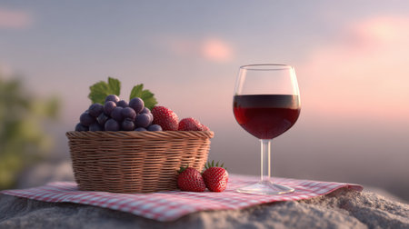 Enjoy a serene outdoor setting featuring a basket of fresh grapes and strawberries alongside a glass of red wine, capturing the essence of relaxation at sunset.