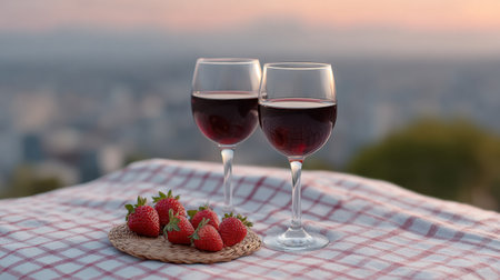 Enjoy a romantic evening featuring two glasses of red wine and fresh strawberries, set against a beautiful sunset view. Create lasting memories.