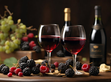 Two elegant glasses filled with red wine sit alongside a vibrant assortment of fresh berries, creating a visually appealing and indulgent table setting.
