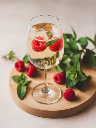 A refreshing white drink garnished with raspberries and mint, served in a clear glass.