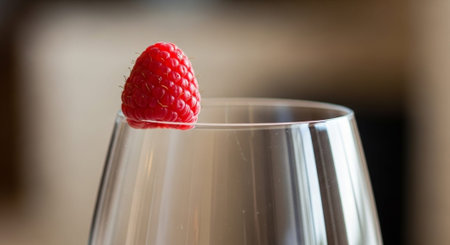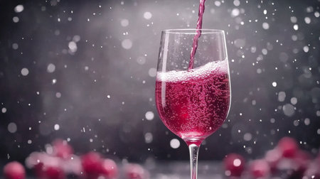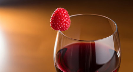 A clear wine glass filled with red wine stands elegantly on a table, surrounded by decorative red berries. The background features a soft bokeh effect creating a warm, inviting atmosphere.