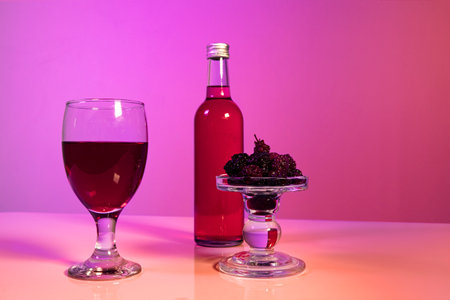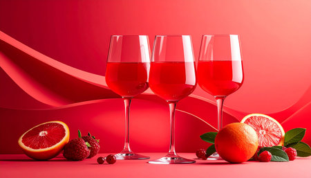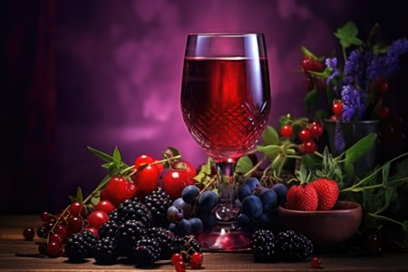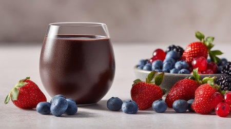 A stunning ruby red drink stands elegantly in a glass, surrounded by an array of fresh, juicy berries. This still life composition captures the essence of indulgence.