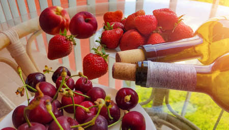 Close-up of two lying wine bottles, a pile of fruits and berries on a transparent glass table, on an open balcony, on a sunny summer day.