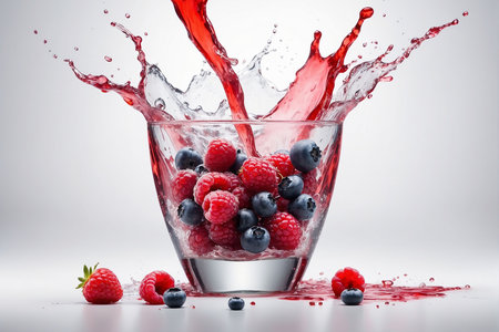Fruit splashing out of a glass of blackberry and raspberry juice