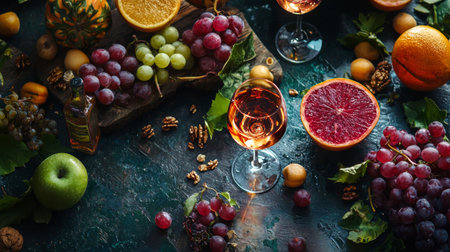 A rustic table set with wine glasses, grapes, citrus fruits, and nuts, creating a vibrant and elegant composition.