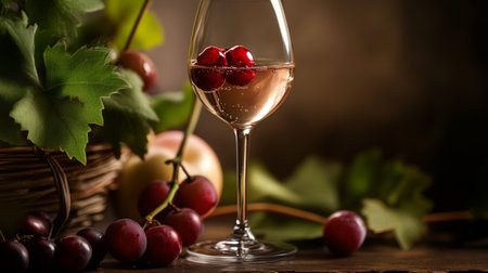A wine glass filled with red wine surrounded by a basket of grapes and rustic decor, creating a warm and inviting atmosphere.