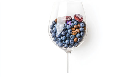 A glass of red wine surrounded by a variety of fresh berries. This image can be used to showcase the beauty of wine and fruit, as well as for food and beverage related projects.