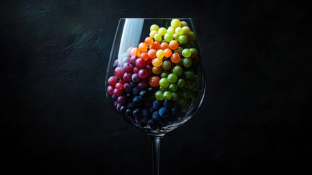 Vibrant grapes of various colors arranged inside a wine glass, highlighting diversity and elegance against a dramatic dark backdrop.