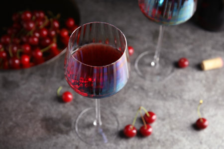 Wine glasses. They stand or lie on a gray background. They are filled with wine and coffee, cranberries.