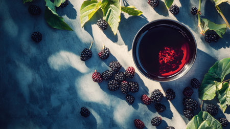 A beautiful arrangement of fresh blackberries and a bowl of berry juice on a dark surface, capturing the essence of summer with vibrant colors and natural textures.