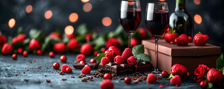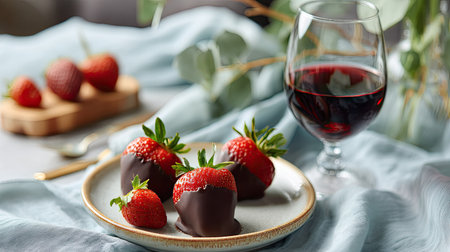 A romantic dessert setting with strawberries dipped in chocolate and a glass of red wine, perfect for a date night