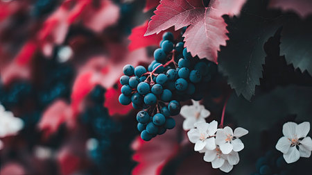 A close-up of the leaves and grapes on an autumn vineyard, with purple grape clusters creating a beautiful backdrop. The focus is sharp on these vibrant green leaves and dark blue berries against a blurred background of white blooming flowers and red wine-colored leaves. This scene captures the essence of fall in an idyllic countryside setting. --chaos 30 --ar 16:9 --v 6.1 Job ID: 156538c6-1a79-40bf-8fb9-f0c5d9651b00