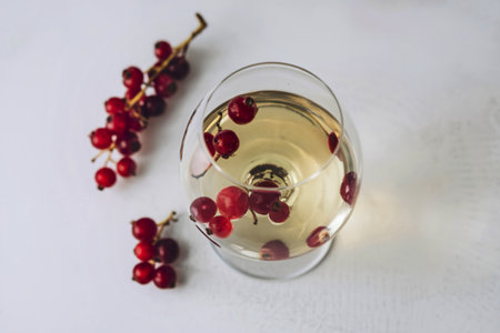 A photograph of a chilled glass of white wine with a scattering of vibrant red currant berries