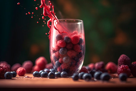 A close-up view of refreshing fruit juice in an elegant glass, accompanied by an array of fresh berries, showcasing vibrant colors and healthy appeal for food themes.