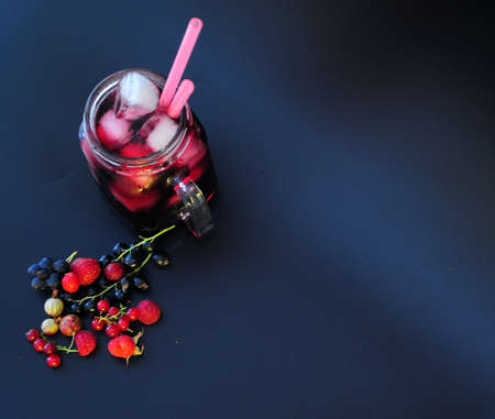 Glass mug of berry juice with ice and straws near a heap of different soda berries on a black background. Close-up.