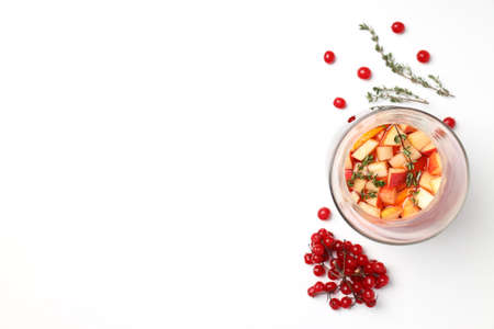 Delicious refreshing sangria with fresh fruits and berries on light gray table
