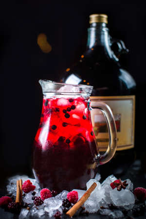 Refreshing homemade lemonade or sangria punch with citrus fruits and organic berries. Summer cocktail with ice and fruit juice in a glass bottle. Tasty drinks. Vertical shot