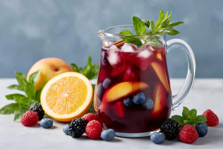 Refreshing fruit punch combines summer fruits in a colorful pitcher, perfect for sunny gatherings.