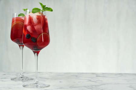 Summer cold cocktail, fruit and berry red wine sangria with apple, lemon, oranges and raspberry. light background, copy space