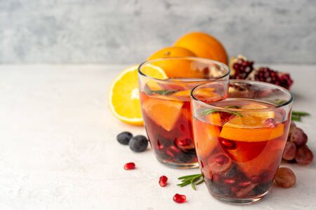 Homemade sangria with orange, grapes and pomegranate seeds in glasses on concrete background. Selective focus.