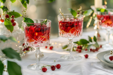 A vibrant display of refreshing berry drinks in elegant glasses, adorned with mint leaves and surrounded by cheerful foliage, creating a joyful atmosphere for a sunny gathering.