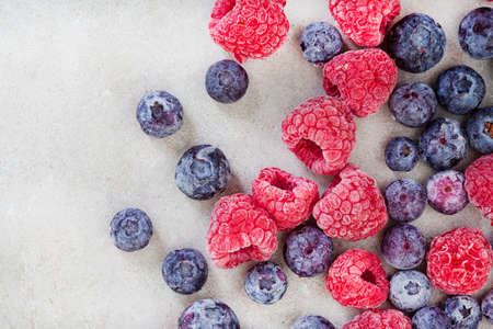 Frozen blueberries and raspberries with water droplets on light grey with copy space