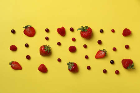 Delicious fresh berry mix on yellow background