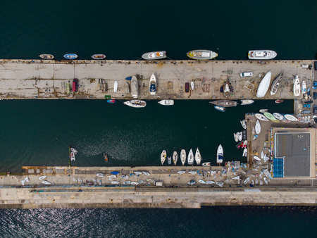 Drone aerial scenery of a fishing port. Fishing boats and yachts moored in the harbour
