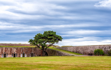 Fort George Ardersier Inverness Scotland fortifications with a single pine tree in front of the barracks, Scotland, UK