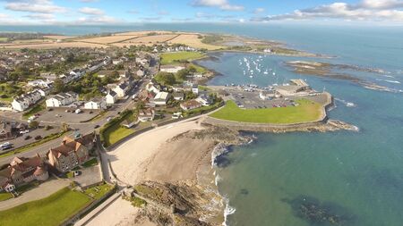 Aerial view of a coastal town with piers, boats, and buildings, transitioning from a harbor to residential and camping areas in Seahouses village, UK.