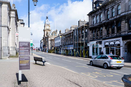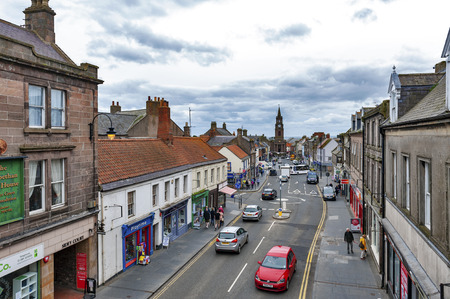 Berwick-upon-Tweed, England - April 2018: High Street in town center of Berwick-upon-Tweed, northernmost town in Northumberland at the mouth of River Tweed in England, UK