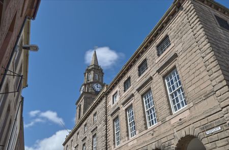 Town Hall on Marygate in Berwick. Berwick upon Tweed is the most northerly town in England and is located in Northumberland at the mouth of the River Tweed just below the Scottish border
