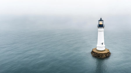 A lone lighthouse emerges from dense sea fog, guiding ships safely