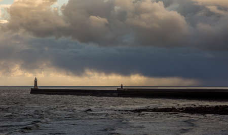 Rain clouds hang overhead the Piers at the mouth of the Tyne in northeast England