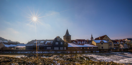 Franconian City of Karlstadt at the River Main in Germany. Lovely evening with clear blue sky in early April spring. Old medieval city with city wall and tower