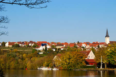 scenic historic village of Frickenhausen at river Main with reflection in the river