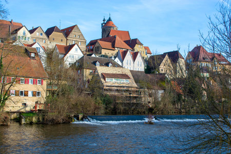 Schwäbisch Hall, Germany - July 25, 2019; City view with half timbered houses on the waterfront of a touristic town on the romantic road in Bavaria