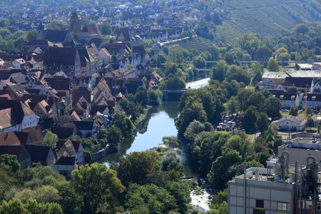 2022: View over the Enz to the old town with town hall, Besigheim, Baden-Wuerttemberg, Germany