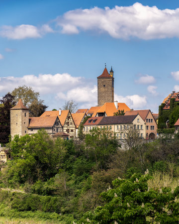 Rothenburg ob der Tauber, old famous city from medieval times seen from the romantic valley of the river Tauber